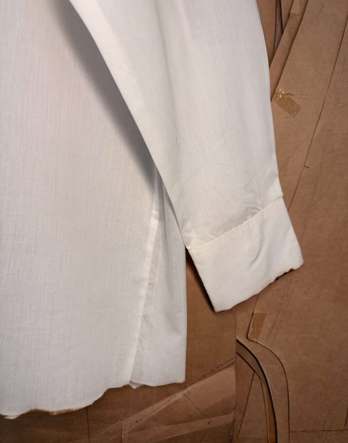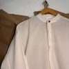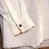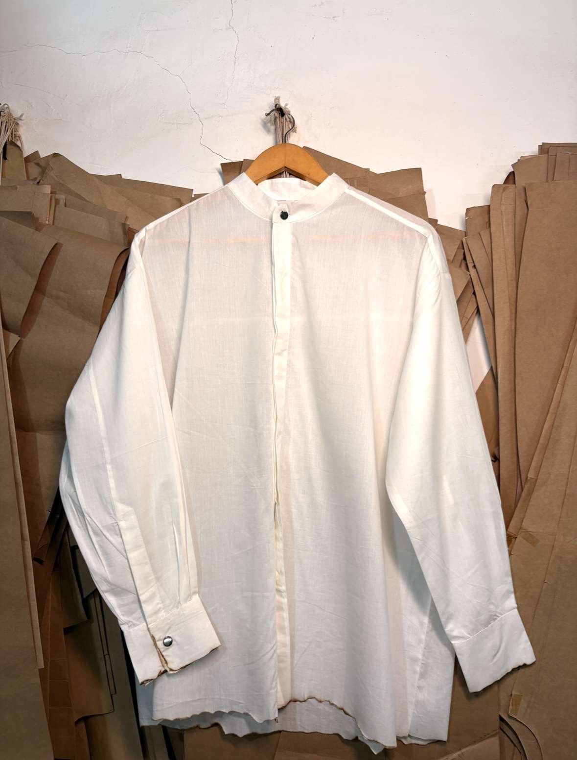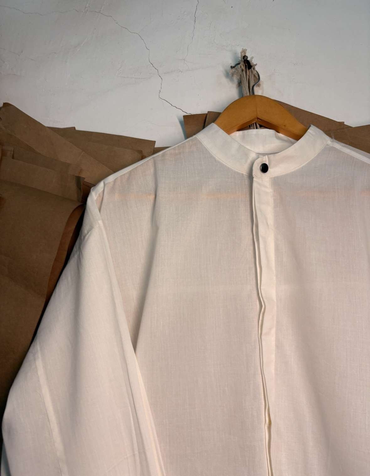 - It features a hidden button placket for a clean front, with a matte grey metal snap at the neck and cuff, a small detail that holds the design together. Light, raw, and effortless,
