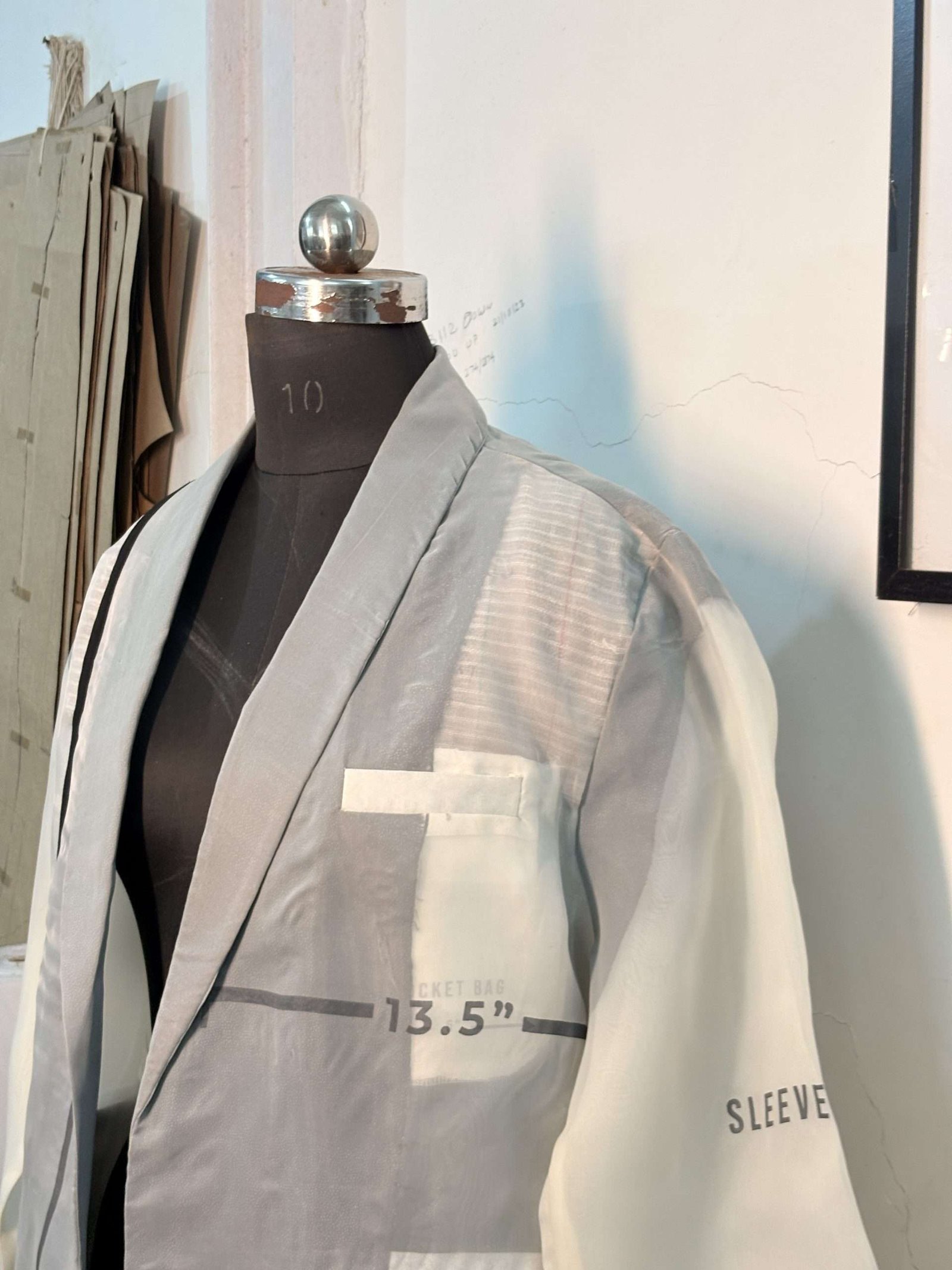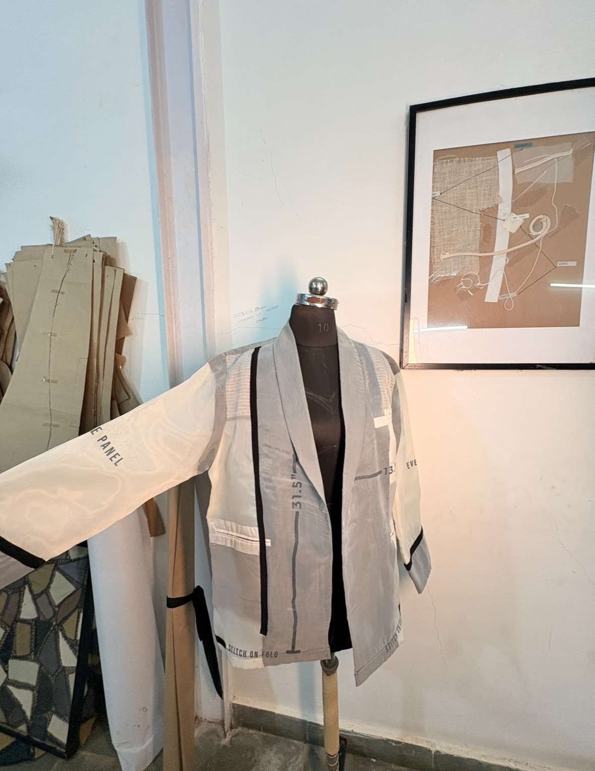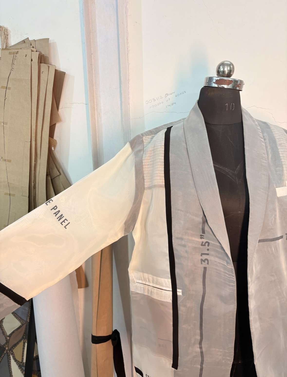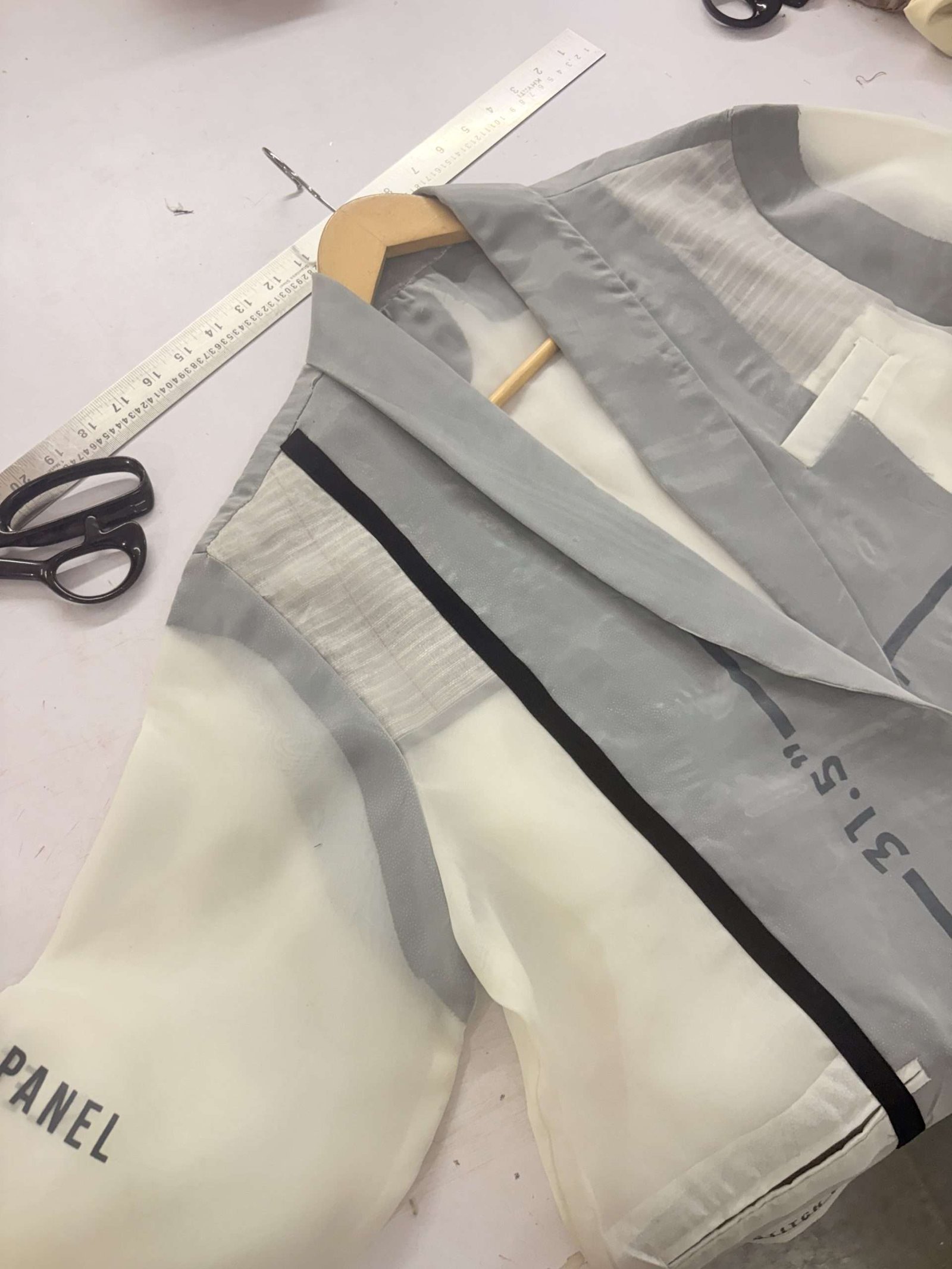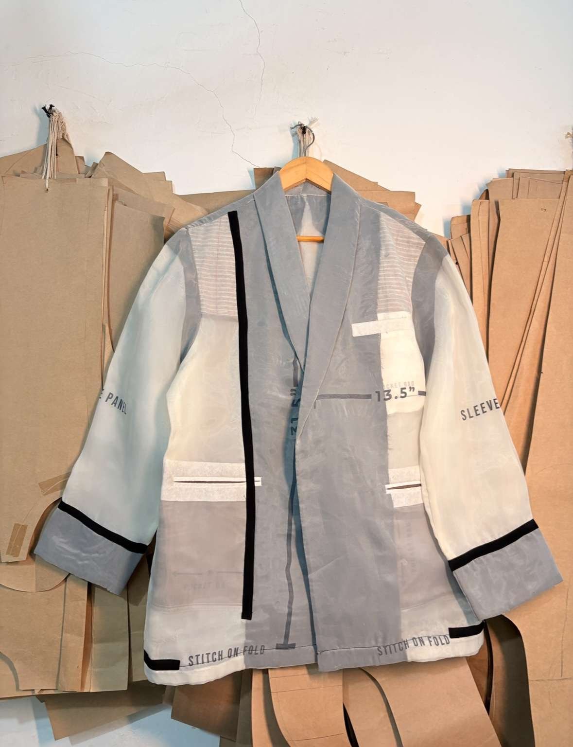 Instead of hiding what goes on beneath the surface, this piece celebrates it. Made with two layers of fine organza, pressed together to reveal the entire anatomy of a blazer , from the raw stitches and fusing to the chalk marks and pattern numbers that usually stay unseen. Every thread, every imperfection, is intentional.